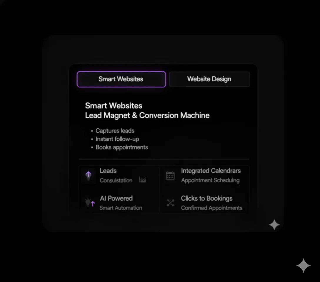 Forget throwing cash at ads that don’t convert. Our AI-powered Smart Website captures leads, follows up instantly, and books appointments on autopilot - turning clicks into confirmed bookings.